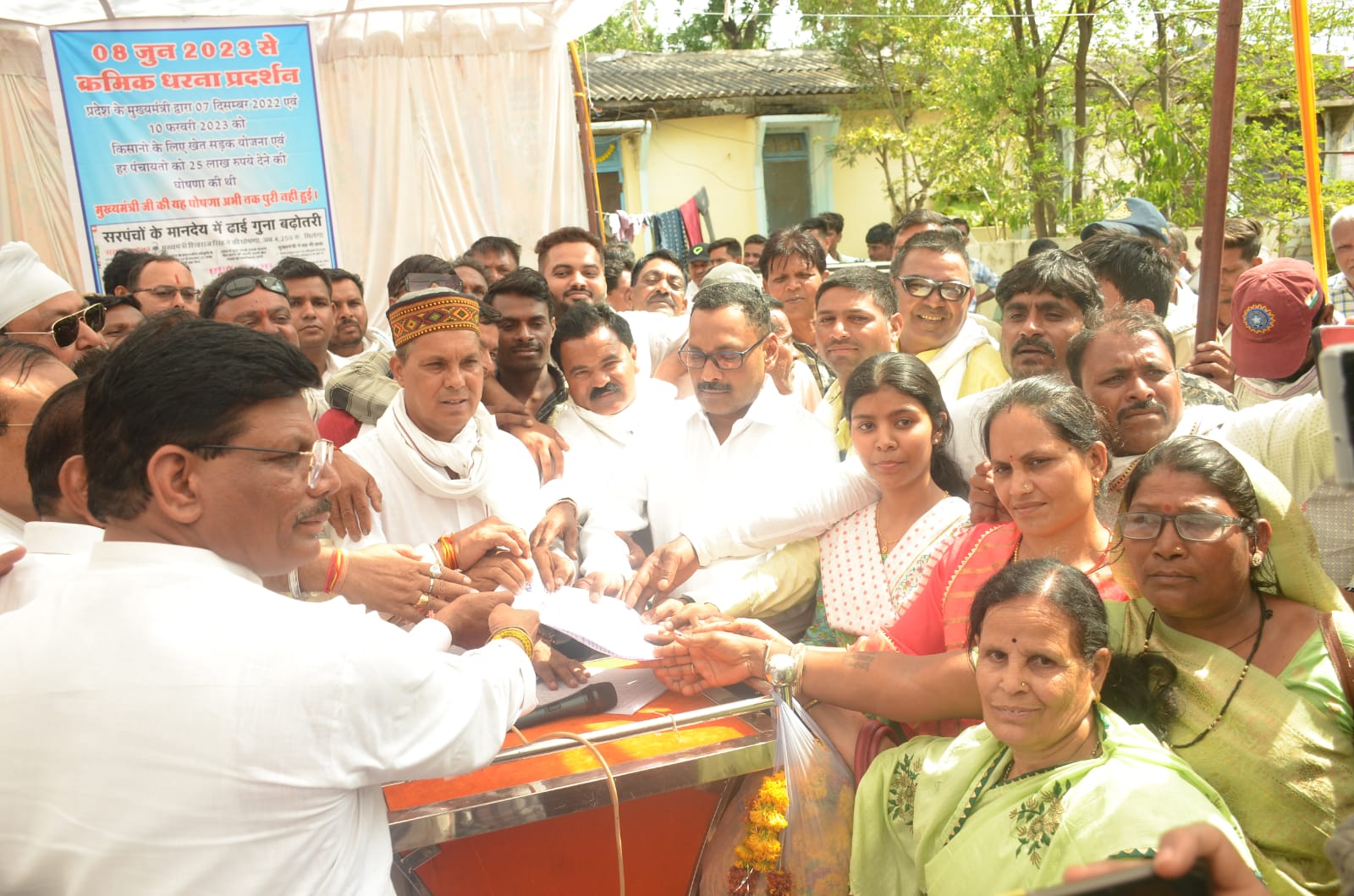 सरदारपुर ,प्रदेश के मुख्यमंत्री द्वारा सुदूर सडक एवं खेत सडक की स्वीकृति प्रदान करने की द्योषणा के बाद मध्यप्रदेश राज्य रोजगार गारंटी परिषद् के आयुक्त द्वारा 16 मई 2023 को खेत/सुदूर संपर्क सडक की स्वीकृति के संसोधन के निर्देश के कारण ग्राम पंचायत स्तर पर कुल व्यय का अधिकतम 15 प्रतिशत व्यय खेत/सुदूर संपर्क सडक के कार्यो मे करने हेतु निर्देश के कारण खेत/सुदूर संपर्क सडक की स्वीकृति नही मिलने से एवं सरदारपुर विधानसभा मे विगत 2 से 3 वर्ष से स्वीकृत 4 सुदूर/ग्रेवल रोड, 6 स्लेब कलवर्ट/पुलिया निर्माण एवं 5 गौशाला निर्माण कार्य प्रारंभ नही करने एवं लगभग 30 सुदूर सडक के कार्य अपूर्ण होने से विधायक प्रताप ग्रेवाल के नेतृत्व में जारी क्रमिक धरने प्रदर्शन के नोवे दिन शुक्रवार को दोपहर मे धार जिला पंचायत के मुख्य कार्यपालन अधिकारी श्रृंगार श्रीवास्तव द्वारा धरना स्थल पर पहुचकर विधायक प्रताप ग्रेवाल सहित जनप्रतिनिधीयो से चर्चा कर अप्रारंभ कार्य शीघ्र ही प्रारंभ करने, अपूर्ण कार्य पूर्ण करने, सुदूर सडक की मरम्मत के लिए 15वे वित से राशि स्वीकृत करने एवं शासन स्तर की मांगो को शासन को प्रेषित करने का उचित आश्वासन देते हुए क्रमिक धरना प्रदर्शन समाप्त करवाया