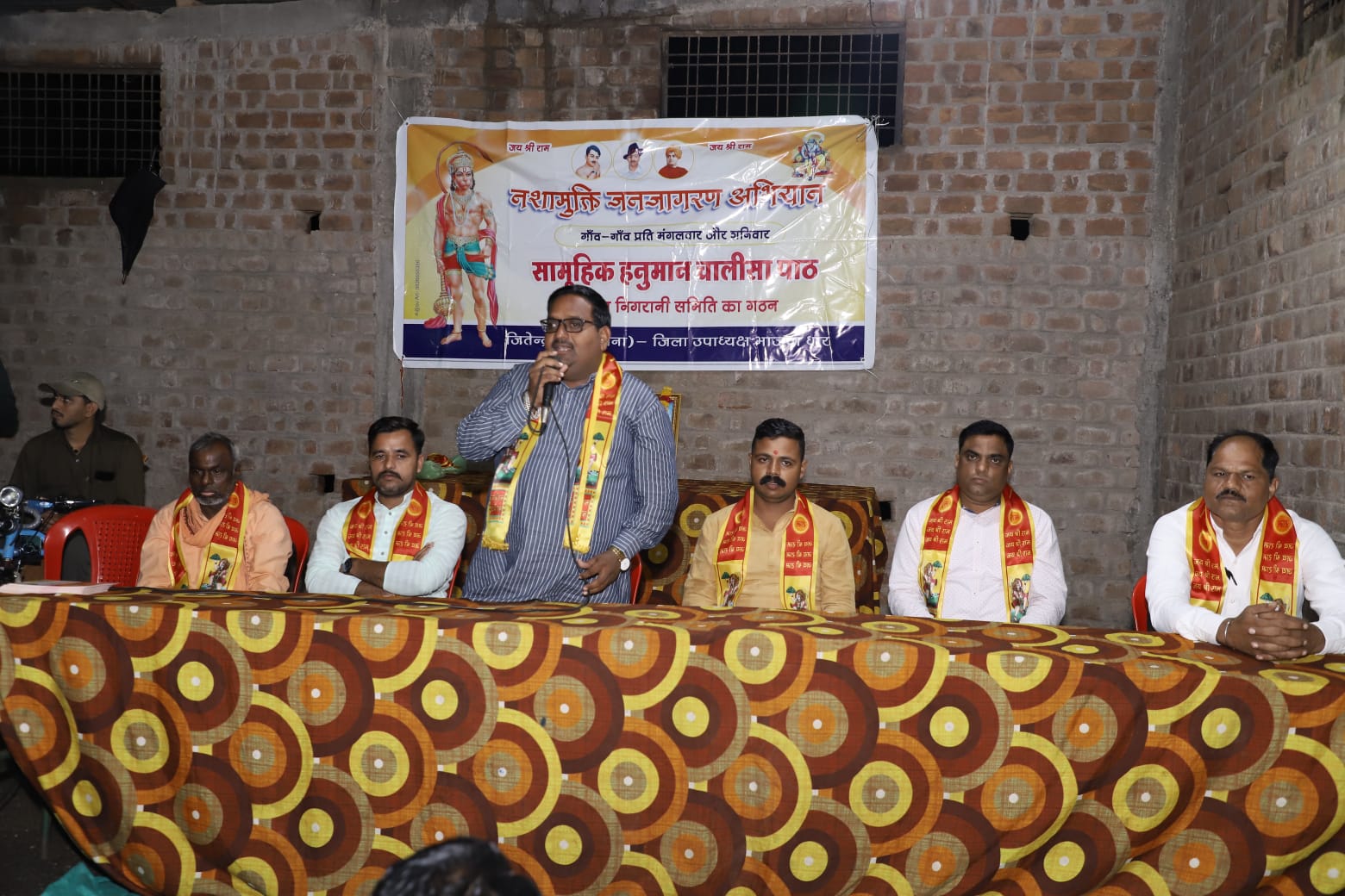 नशा मुक्ति जन जागरण अभियान के तहत शनिवार को चिराखन में कार्यक्रम सम्पन्न हुआ वहीं कार्यक्रम के संयोजक जितेन्द्र जाट ने कहा नशा एक बुराई है नशा समाज के लोगों के लिए भी दुख दाई है नशा गांव वालों से नशे से युवाओं को बचाने के लिए जागरूक व जिम्मेदार नागरिक की भूमिका निभाने की अपील की गांव के पाटीदार धर्मशाला में कार्यक्रम आयोजित किया गया कार्यक्रम के मुख्य अतिथि सामाजिक कार्यकर्ता राहुल डोडिया, विशेष अतिथि अशोक पटेल, जितेन्द्र शर्मा,गट्टू सिंह चौहान, विशिष्ट अतिथि मातृशक्ति अनामिका ठाकुर मौजूद थे अनामिका ठाकुर ने कहा कि नशा करना स्वयं के साथ साथ परिवार को भी बर्बाद करना है। एक बार जिसे नशे की लत लग जाती है वह इसके जाल में फंसता चला जाता है। हमें मिलकर नशे से जंग जीतना है। आपका गांव नशा मुक्त गांव बने। यह लक्ष्य रखे उन्होंने युवाओं को नशा मुक्ति को लेकर संकल्प भी दिलाया कार्यक्रम को संबोधित बनवारी शर्मा ने किया इस दौरान बड़ी संख्या में गांव के युवा मौजूद रहे अंत में हनुमान चालीसा का सामूहिक पाठ कर नशामुक्ति का संकल्प दिलाया गया इस अभियान के यह अभियान मंगलवार व शनिवार को अलग अलग गांवों में चलाया में जा रहा है समिति के सदस्य गांव गांव जाकर बैठक ले रहे है। जिसमें नशे के दुष्परिणाम बताकर नशा छोड़ने का संकल्प दिलवाया जा रहा है
